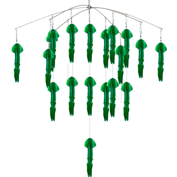 Armado con uno de los llamadores más famosos en el mercado, este dredge de tamaño pequeño y ligero simula una pequeña escuela de peces cerca de la superficie, haciéndose notar desde la distancia. Excelente para embarcaciones pequeñas y medianas que comiencen a pescar con dredges.